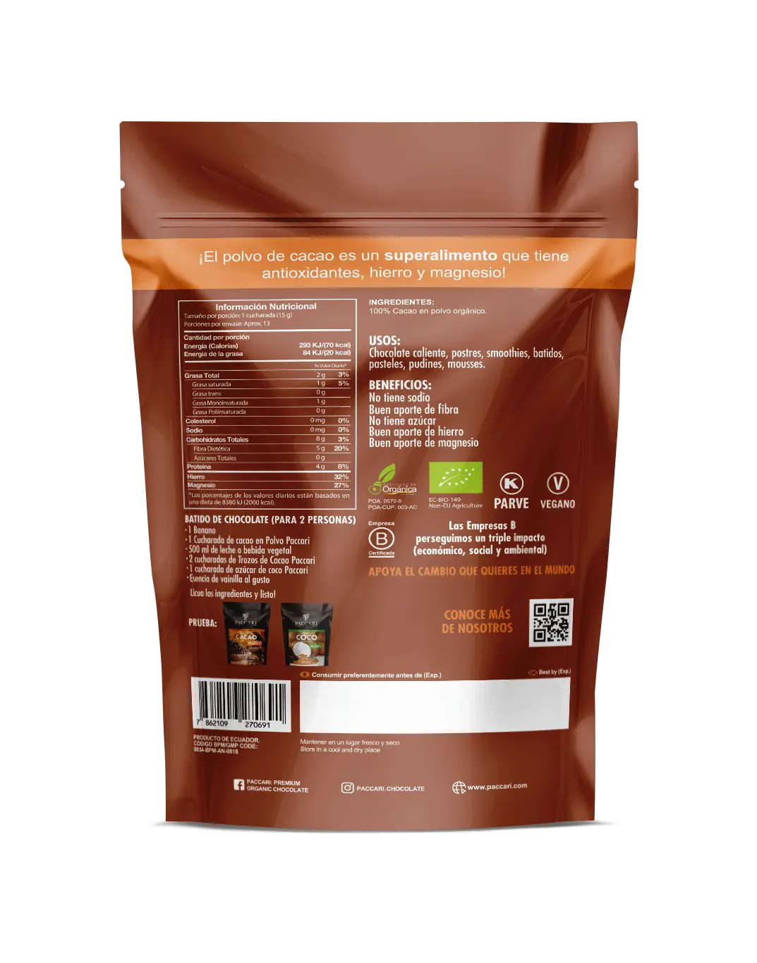 Calidad profesional en tu cocina. Cacao puro en polvo, sin azúcar ni aditivos. Ideal para repostería de alto nivel, batidos y chocolate caliente intenso.