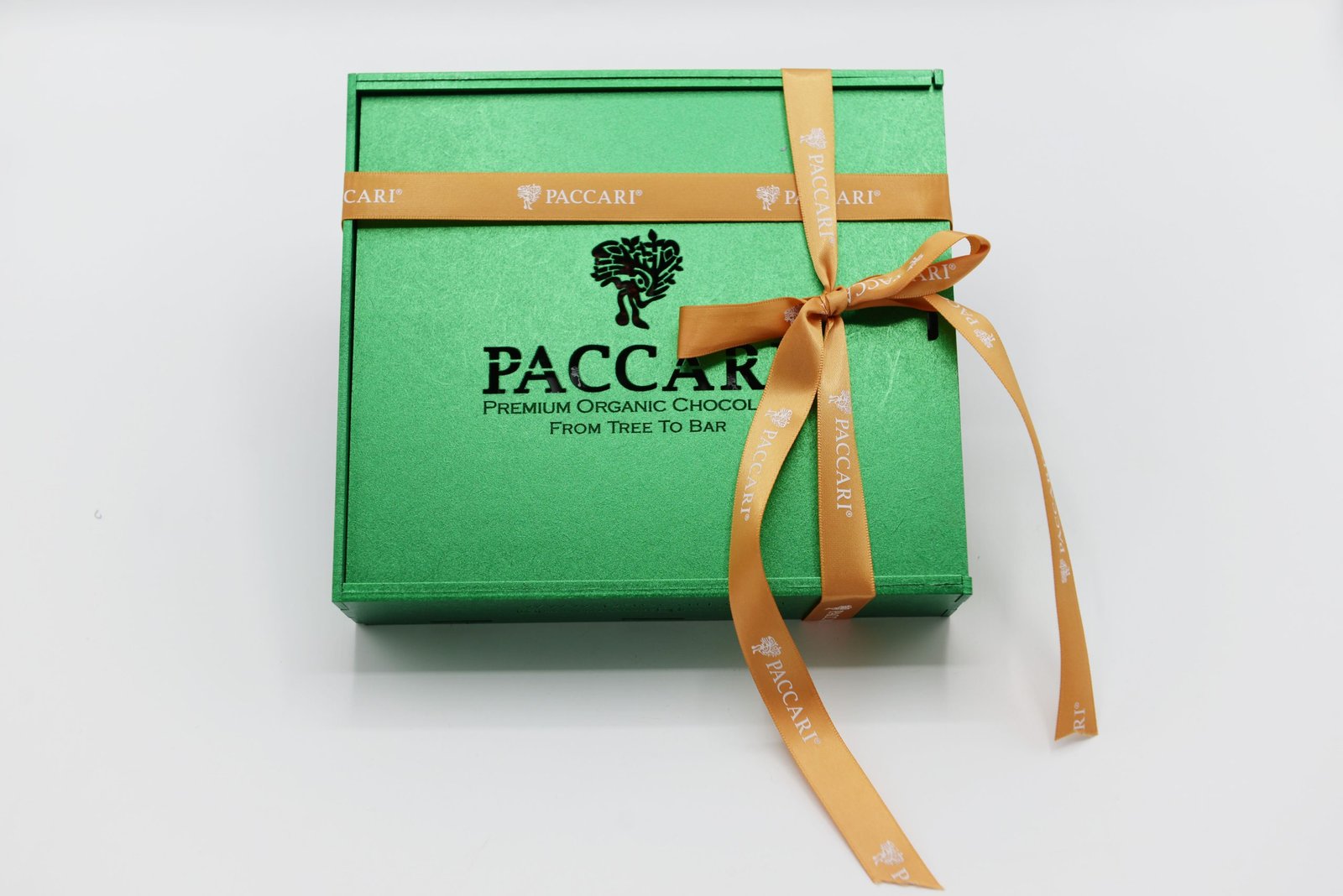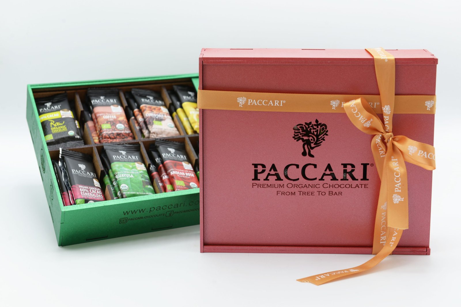 Caja de madera de color mostaza con 32 mini barras del mejor chocolate del mundo.