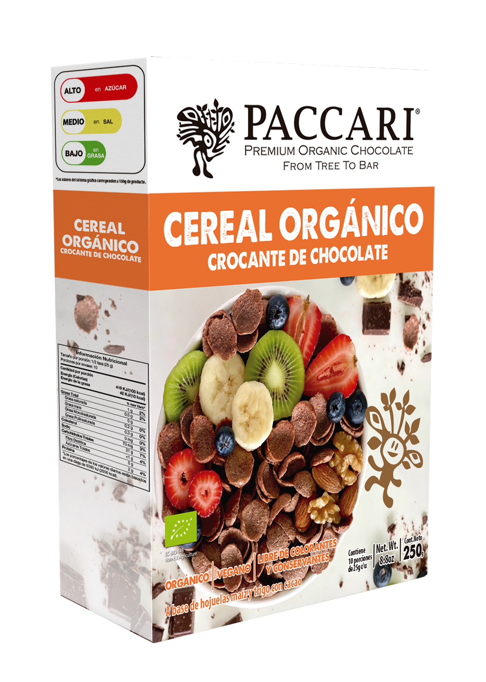 Crunchy y chocolatoso. Hojuelas tostadas cubiertas con cacao orgánico. Ideal para comer con leche o yogurt.