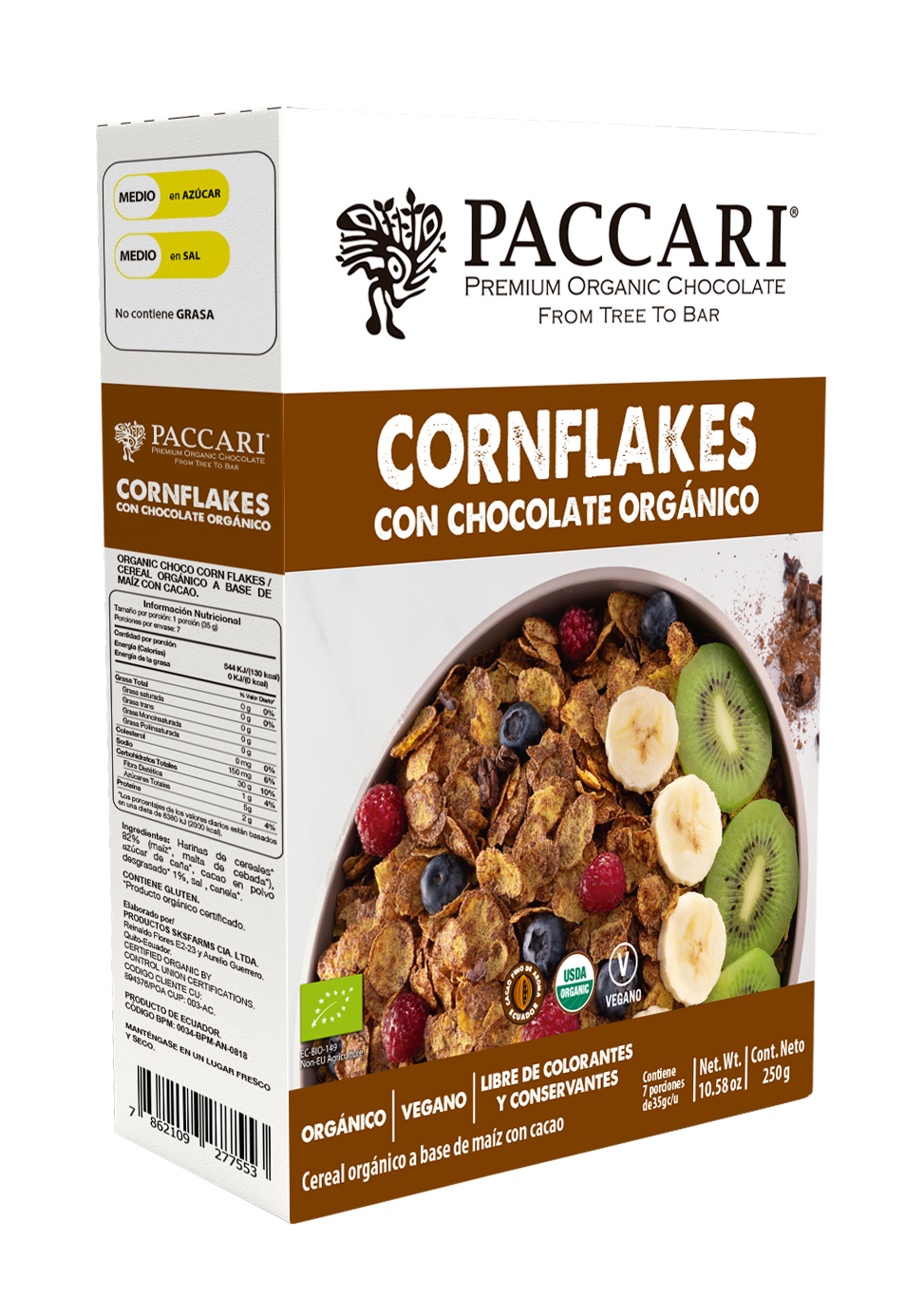 El clásico cornflake mejorado. Hojuelas de maíz orgánico recubiertas con el mejor chocolate ecuatoriano.