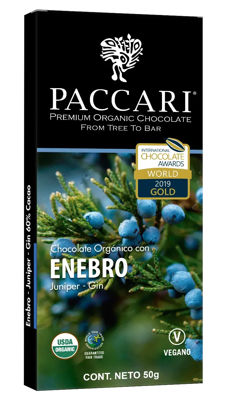 Chocolate oscuro con bayas de Enebro. Notas a pino y bosque.