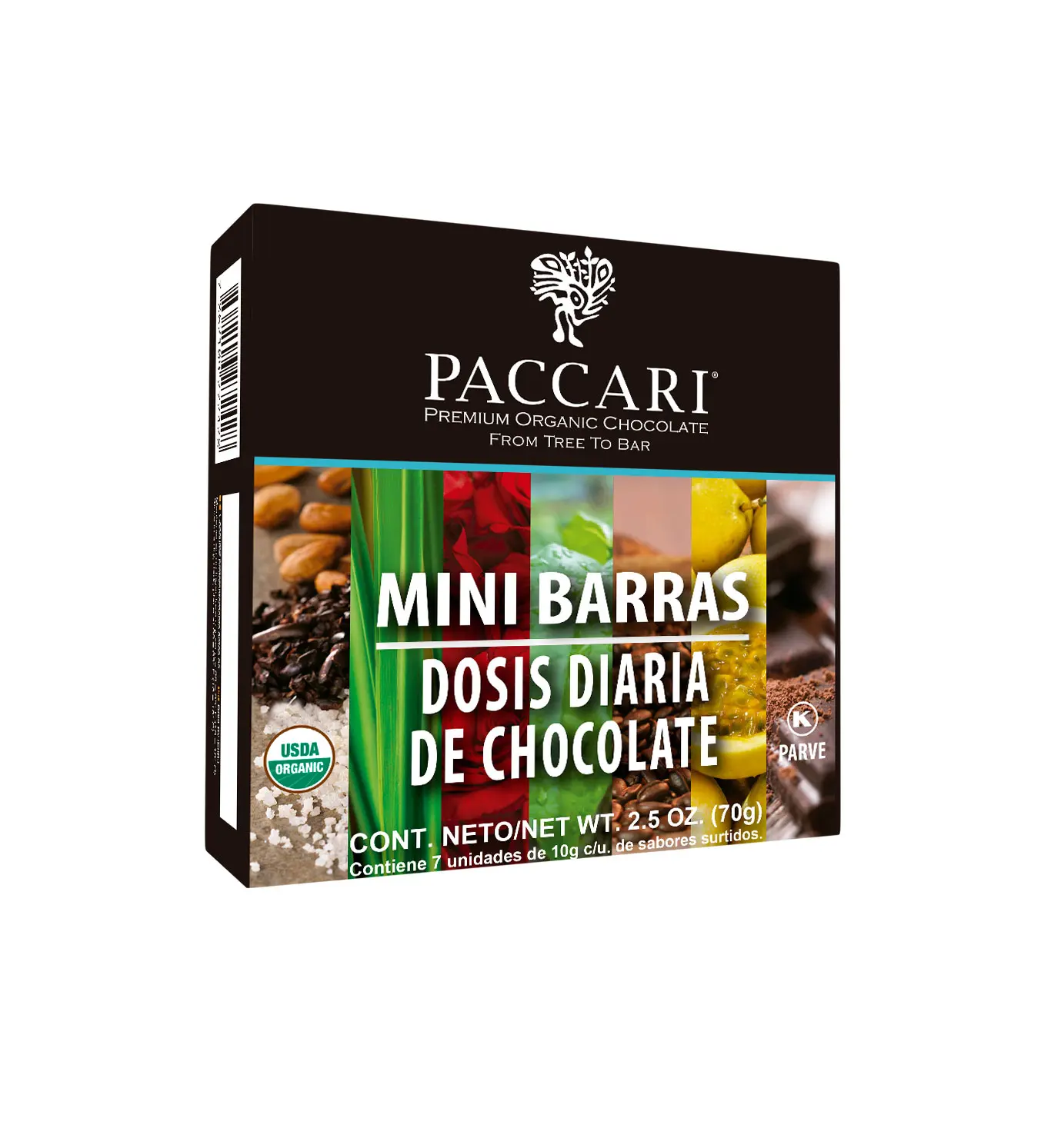 Un chocolate para cada día. Contiene 7 mini barras (Sal, Hierbaluisa, Rosas, Guayusa, Café, Maracuyá, Raw 70%) para llenar tu semana de sabor y energía.
