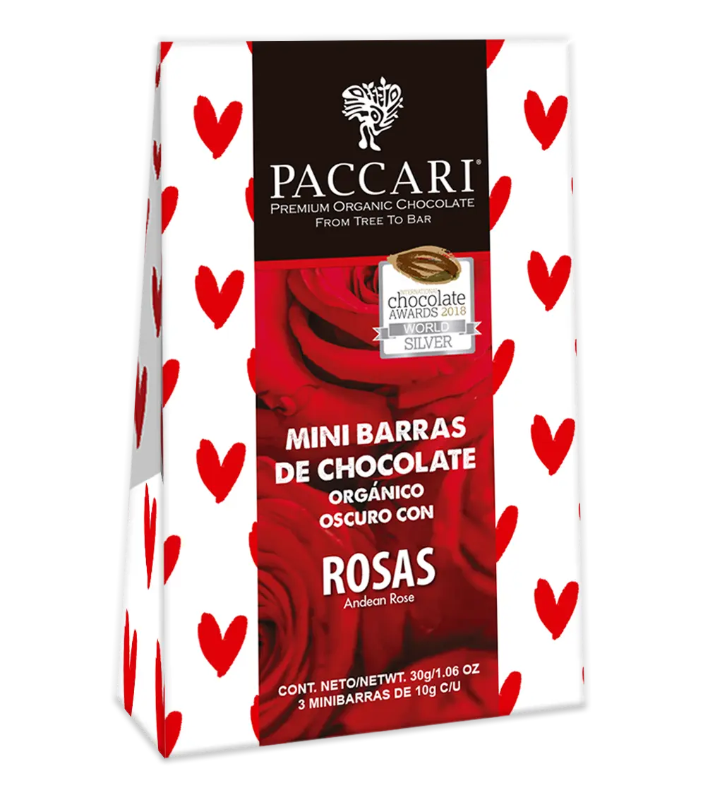 El detalle más romántico. Tres mini barras de nuestro famoso chocolate de Rosas en un empaque diseñado para el amor.