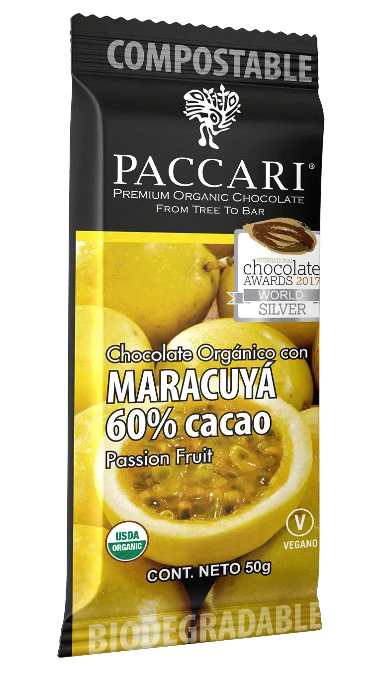 Chocolate oscuro orgánico fusionado con la acidez tropical del maracuyá.