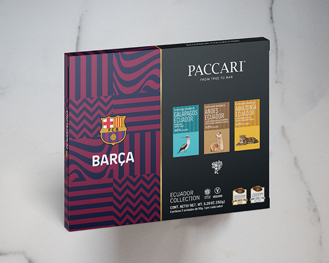 Celebra la pasión por el fútbol y el sabor con esta colaboración especial entre Pacari y el FC Barcelona. Esta elegante caja contiene tres barras de chocolate orgánico al 60% Cacao, cada una representando una región icónica de Ecuador donde se cosecha nuestro cacao: