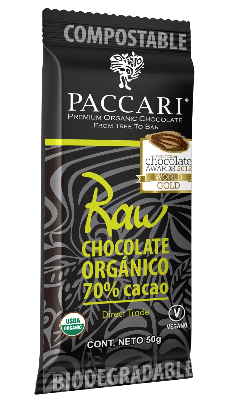 Chocolate crudo 70% cacao, mínimamente procesado para conservar todos sus nutrientes.